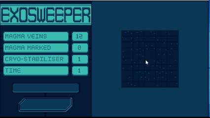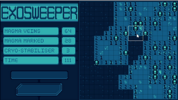 Exosweeper is a space-themed minesweeper game where you use the mouse to mark and avoid lava (mines) and harvest ore (non-mines). Collecting all of the ore on the map wins the game and revealing lava, causes a loss.
